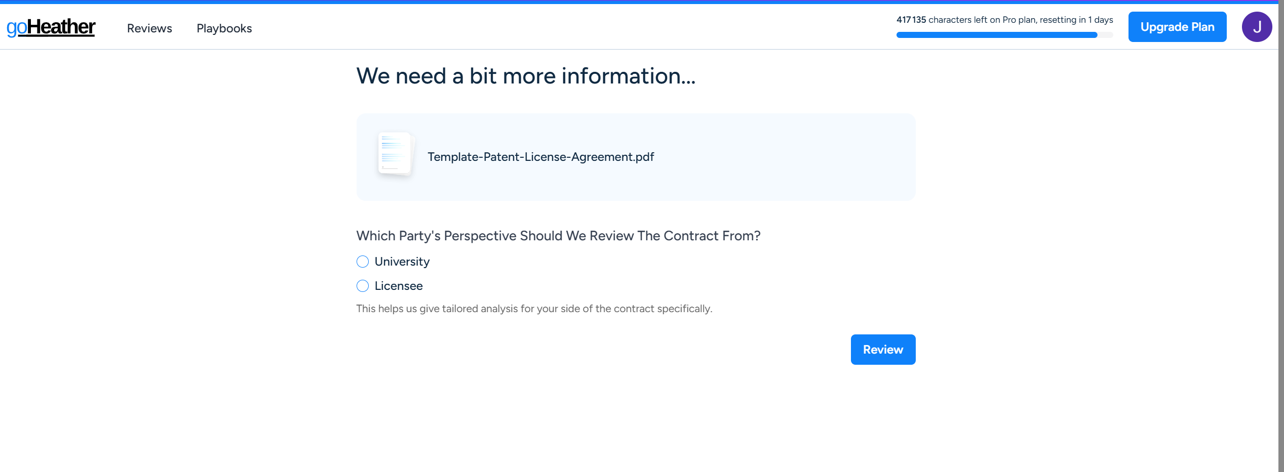The user initiates the review by uploading the contract, which supports PDF or Word (DOCX) file formats, to the secure platform. Alternatively, the review can be started directly within Microsoft Word using the goHeather Word Add-In. During setup, the user specifies the governing law jurisdiction and indicates which side of the contract they represent, allowing the AI to tailor its insights accordingly.